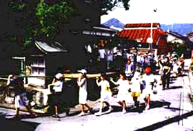 Children make a line to walk around the village, and the top of the line, there is an elder to lead the children. They sing a song called "mushioi-uta" (send insects away-song) and play taiko drums while walking around. It is only quiet countryside event for children.